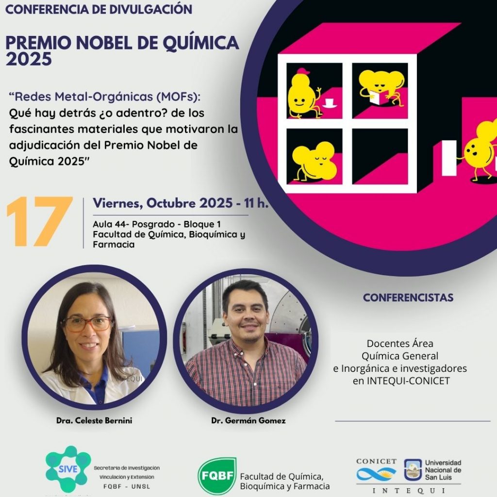 El viernes 17 de octubre se ofrecerá la conferencia "Redes Metal-Orgánicas (MOFs): Qué hay detrás ¿o adentro? de los fascinantes materiales que motivaron la adjudicación del Premio Nobel de Química 2025". La exposición se desarrollará desde las 11 hs. en el aula 44 de posgrado, bloque I de la Facultad de Química, Bioquímica y Farmacia (FQBF) de la Universidad Nacional de San Luis, y estará a cargo de la doctora Celeste Bernini y el doctor Germán Gomez, expertos en la temática, docentes del Área de Química General e Inorgánica e investigadores en el INTEQUI-CONICET. (Ampliar ) . Organizan el Instituto de Investigaciones en Tecnología Química (INTEQUI) y la Facultad de Química, Bioquímica y Farmacia (FQBF-UNSL).