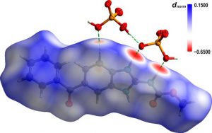 Unidad asimétrica de la nueva sal en la cual se muestra la superficie de Hirshfeld del catión de mebendazol y las principales interacciones intermoleculares que determinan las propiedades del material.