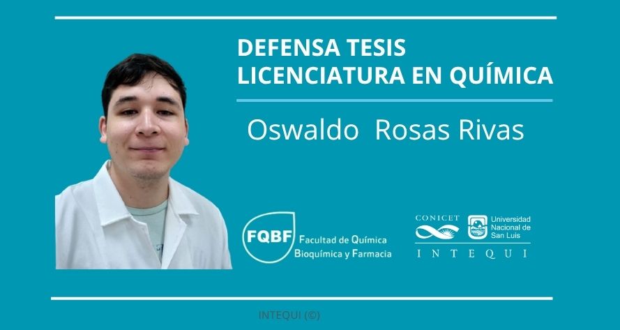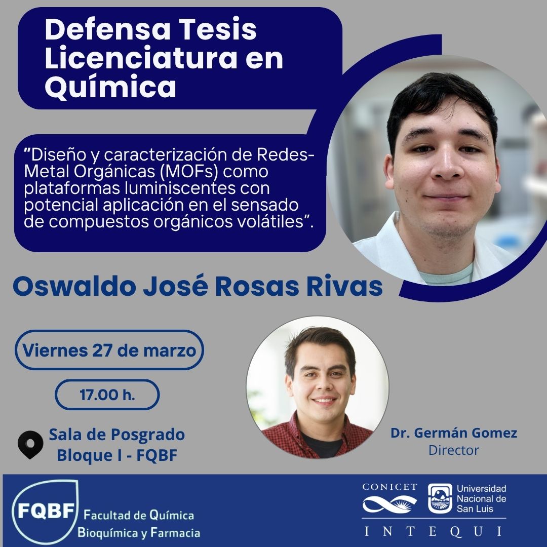 El viernes 27 de marzo de 2026 Oswaldo José Rosas Rivas defenderá su tesis de la Licenciatura en Química que tiene como título "Diseño y caracterización de Redes-Metal Orgánicas (MOFs) como plataformas luminiscentes con potencial aplicación en el sensado de compuestos orgánicos volátiles" El trabajo cuenta con la dirección del doctor Germán Ernesto Gomez, perteneciente al grupo de Química Inorgánica del Instituto de Investigaciones en Tecnología Química (INTEQUI)
